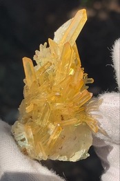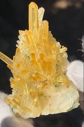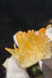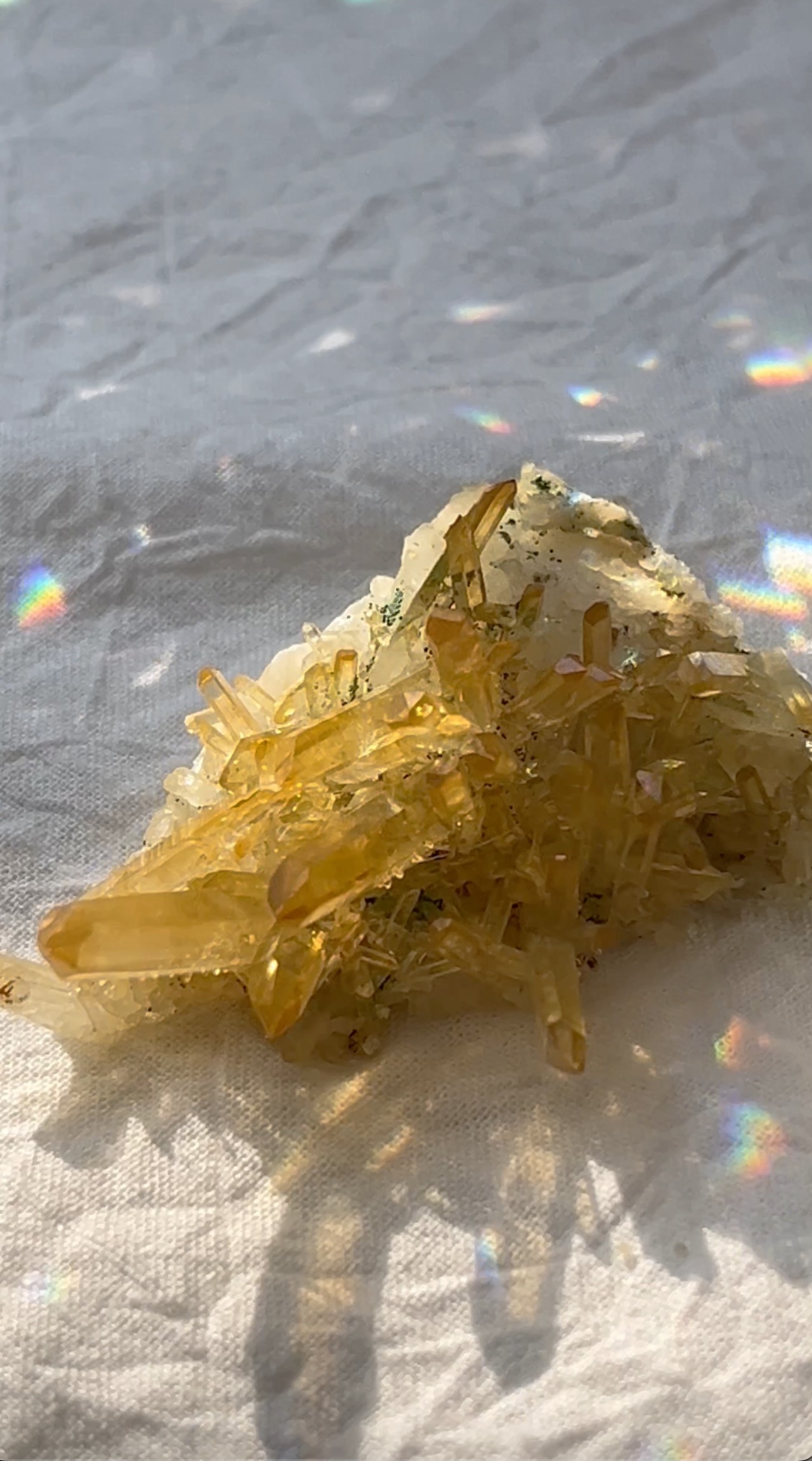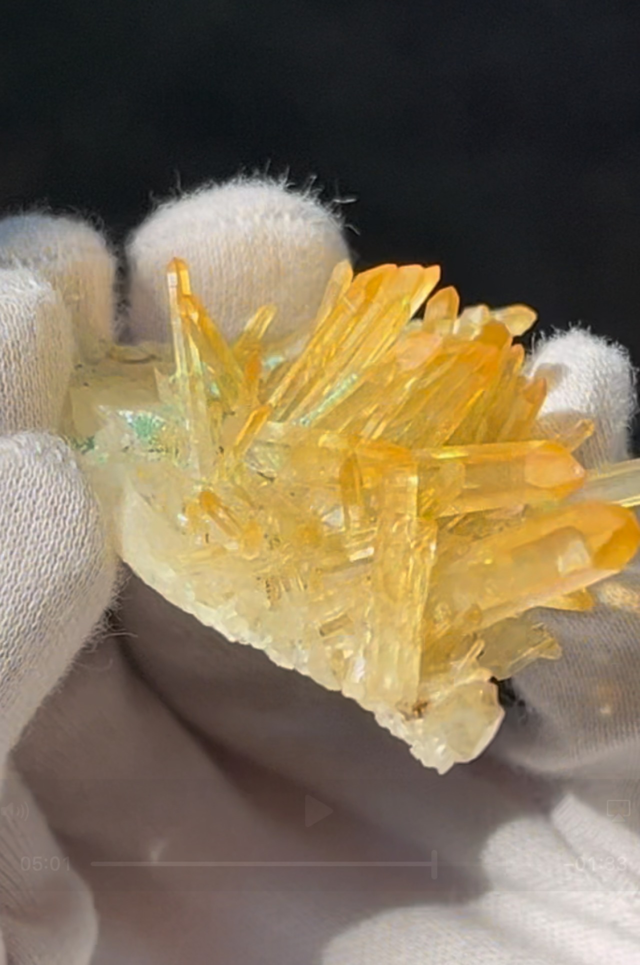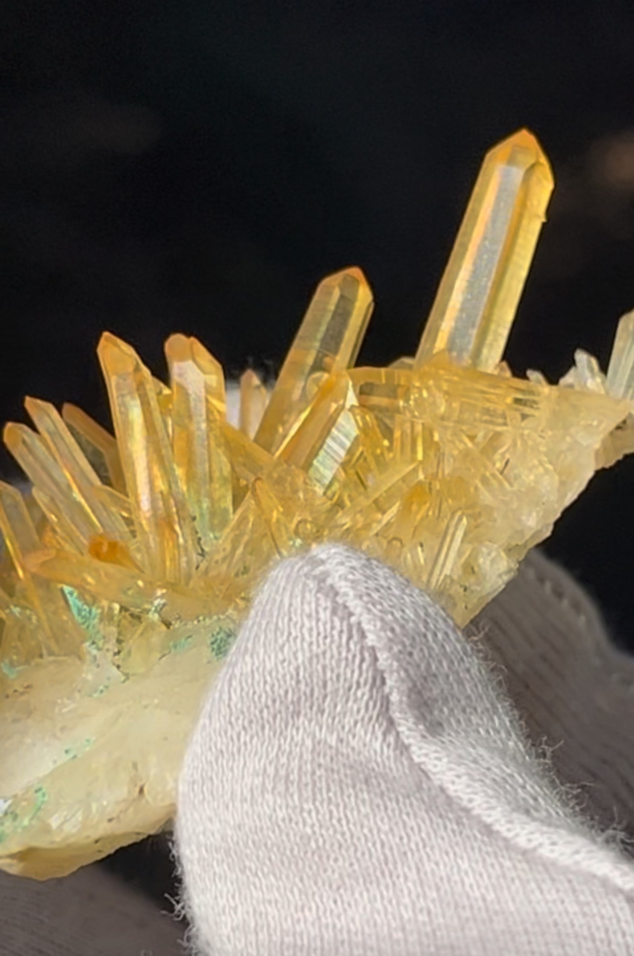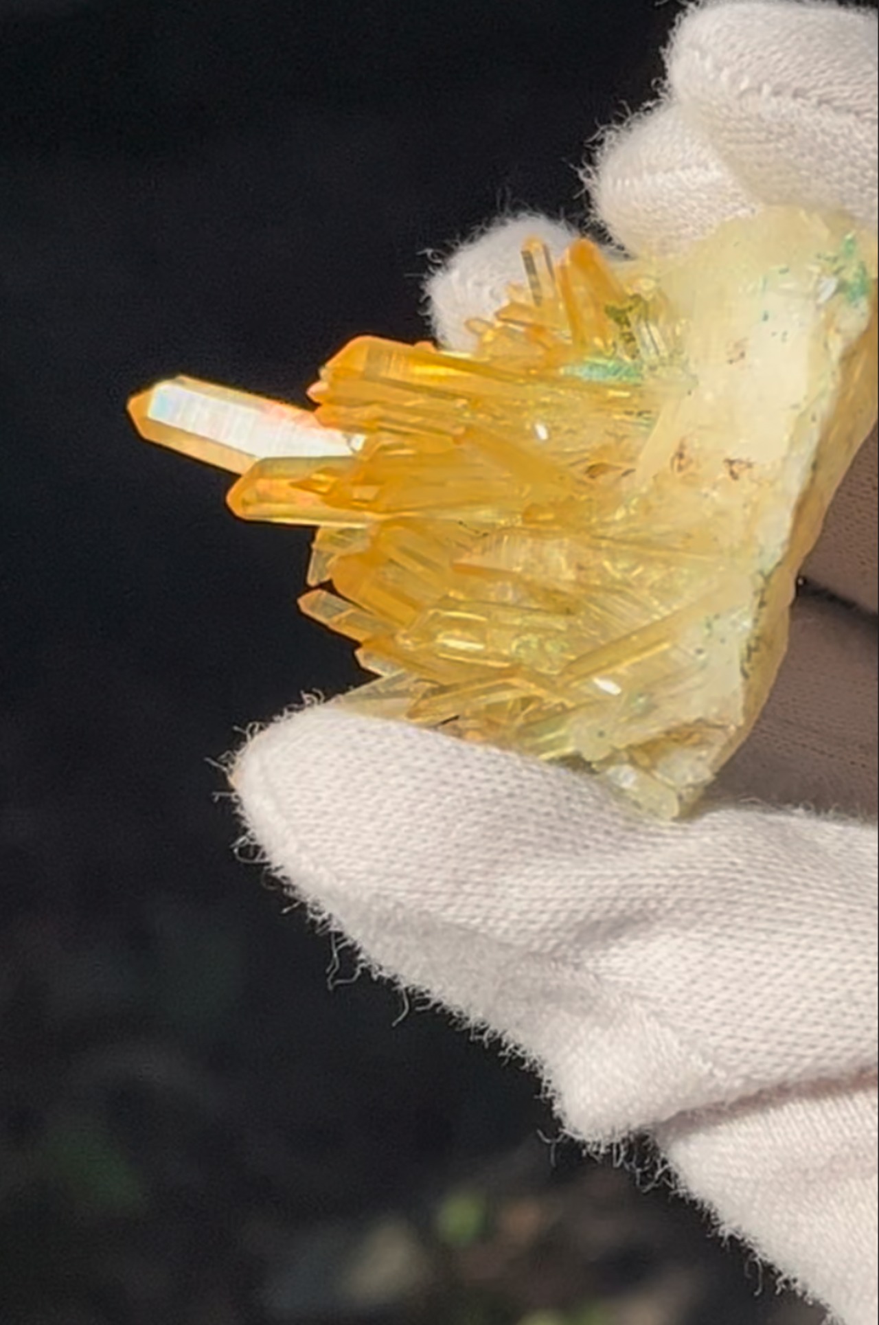 自然に成長して生まれた、表面がオーラ状加工のようになって虹色に輝く、超希少で価値も高いものになります。ゴールドの色も透明で濃く、太陽光が当たると美しいイエローゴールドに輝きます。ニードル部分も美しい形状が保たれた激レア石です。