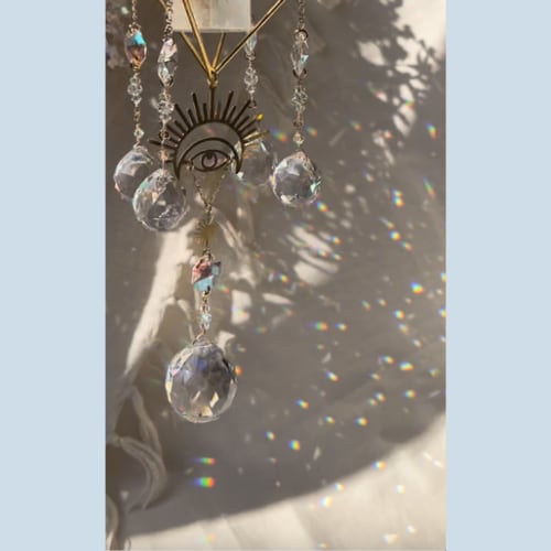 「インナーアイ」と「太陽」のモチーフと、飾りチェーン、クリスタルガラスのボールとビーズを贅沢に使った豪華なクリスタルサンキャッチャー。